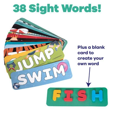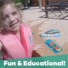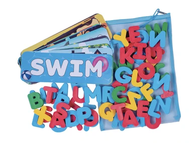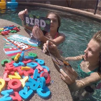 How to play: Throw all of the letters in the pool. They are weighted and will sink! Select a word card and time yourself or race friends to collect the letters needed to spell out the chosen word. The game possibilities are endless!