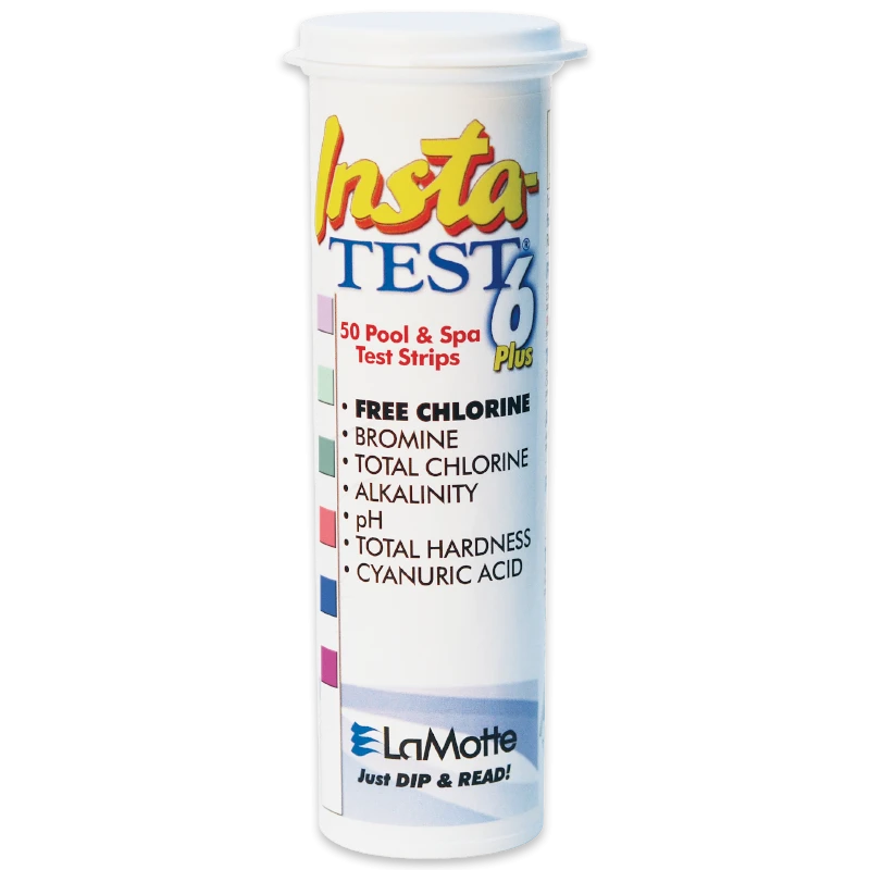 50 Testing strips for your pool or Spa water. Our 6 way pool water test strip will test for 6 different properties. Free chlorine, Total Chlorine, Cyanuric Acid (stabilizer), Calcium, Total Alkalinity and Ph.