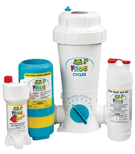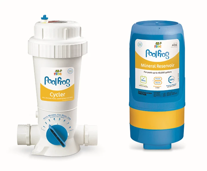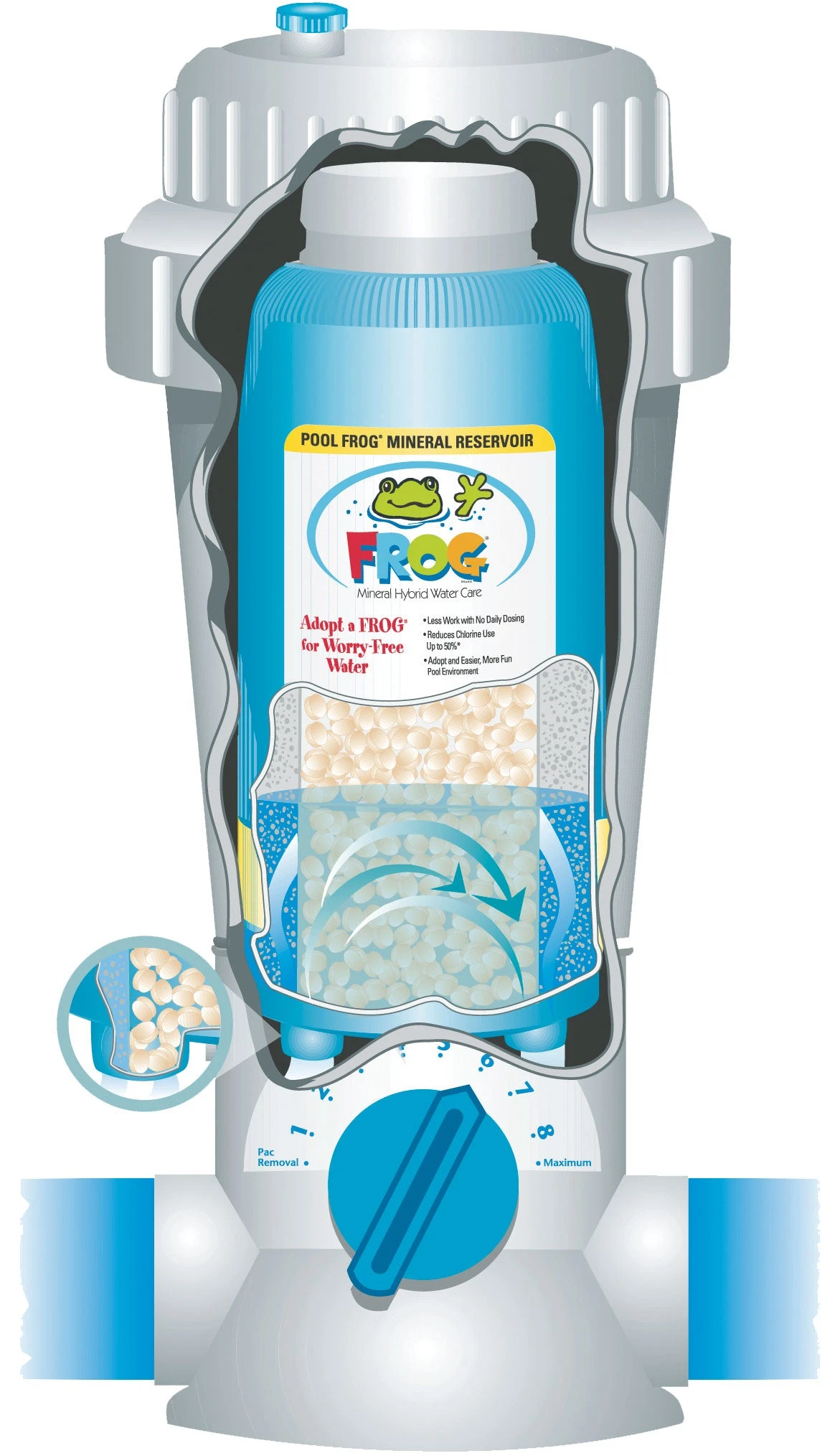 The ultimate delivery of hassle-free Fresh Mineral Water care for in ground pools up to 40,000 gallons. Taking care of your pool has never been easier. Designed using FROG’s No-Touch delivery system, the minerals in our Pool Frog ® Model 5400 continually work hard to control bacteria and keep the pH neutral so your pool water stays clean and clear for weeks. With no daily dosing or heavy chlorine odors, the complete Pool Frog ® Fresh Mineral Water pool system can allow you to cut chlorine use by up to 50%* compared to standard water treatment programs.
