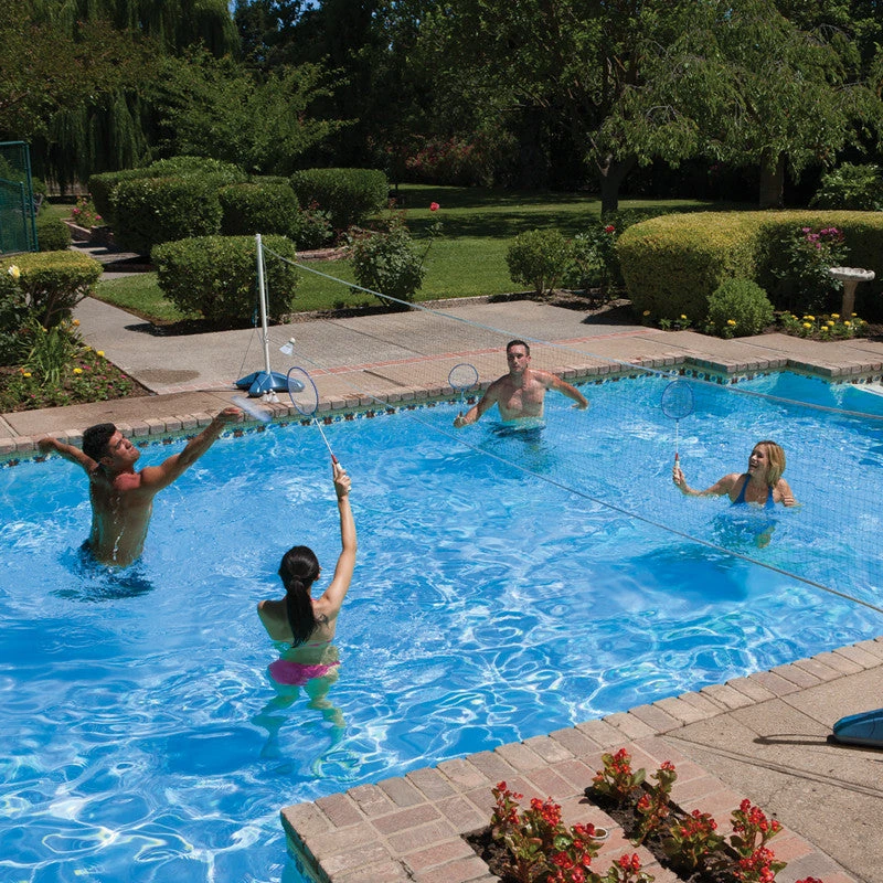 - Set includes: Nylon net, game bases, deluxe water volleyball & inflating needle, 4 metal badminton rackets and 4 birdies