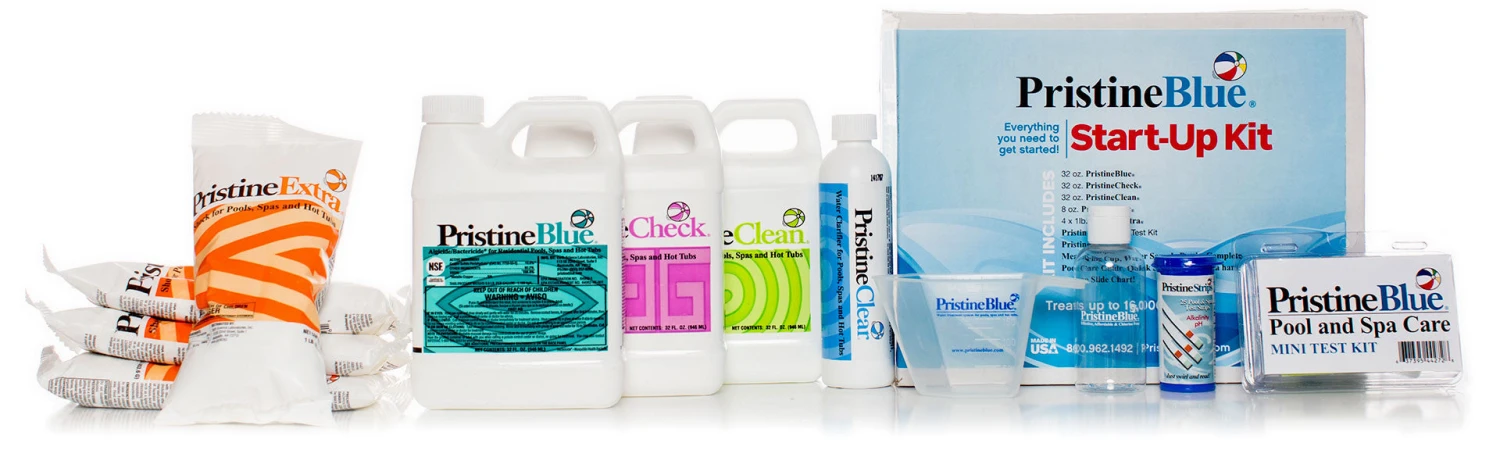 The Pristine Blue Pool Chemical Start Up Kit contains everything you need to get your chlorine pool started on Pristine Blue Pool Chemical.