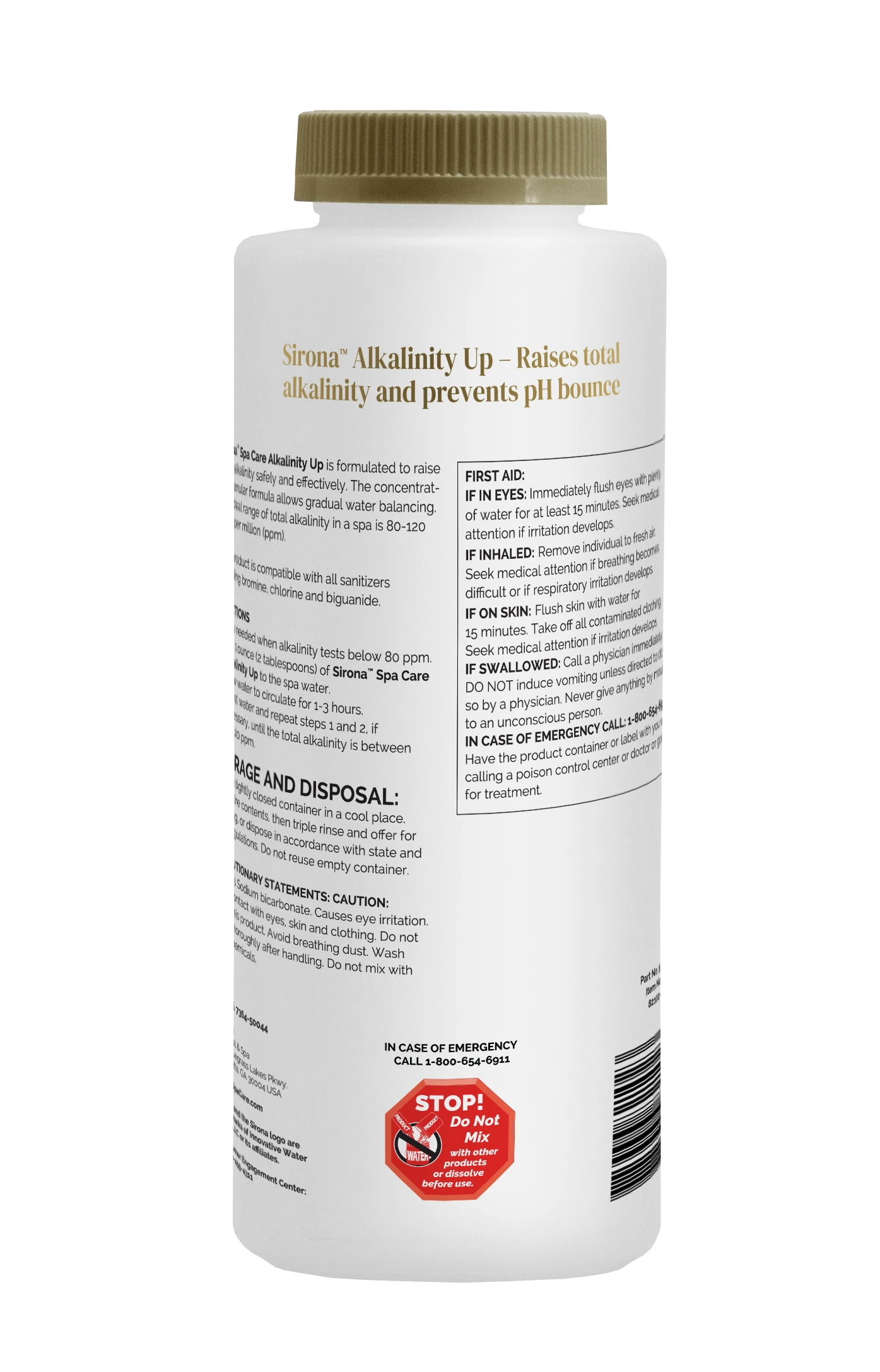 Sirona’s Alkalinity up granular formula increases alkalinity levels in your spa or hot tub water, helps with balancing chemicals such as pH, and prevents damage to hot tub equipment from corrosion.